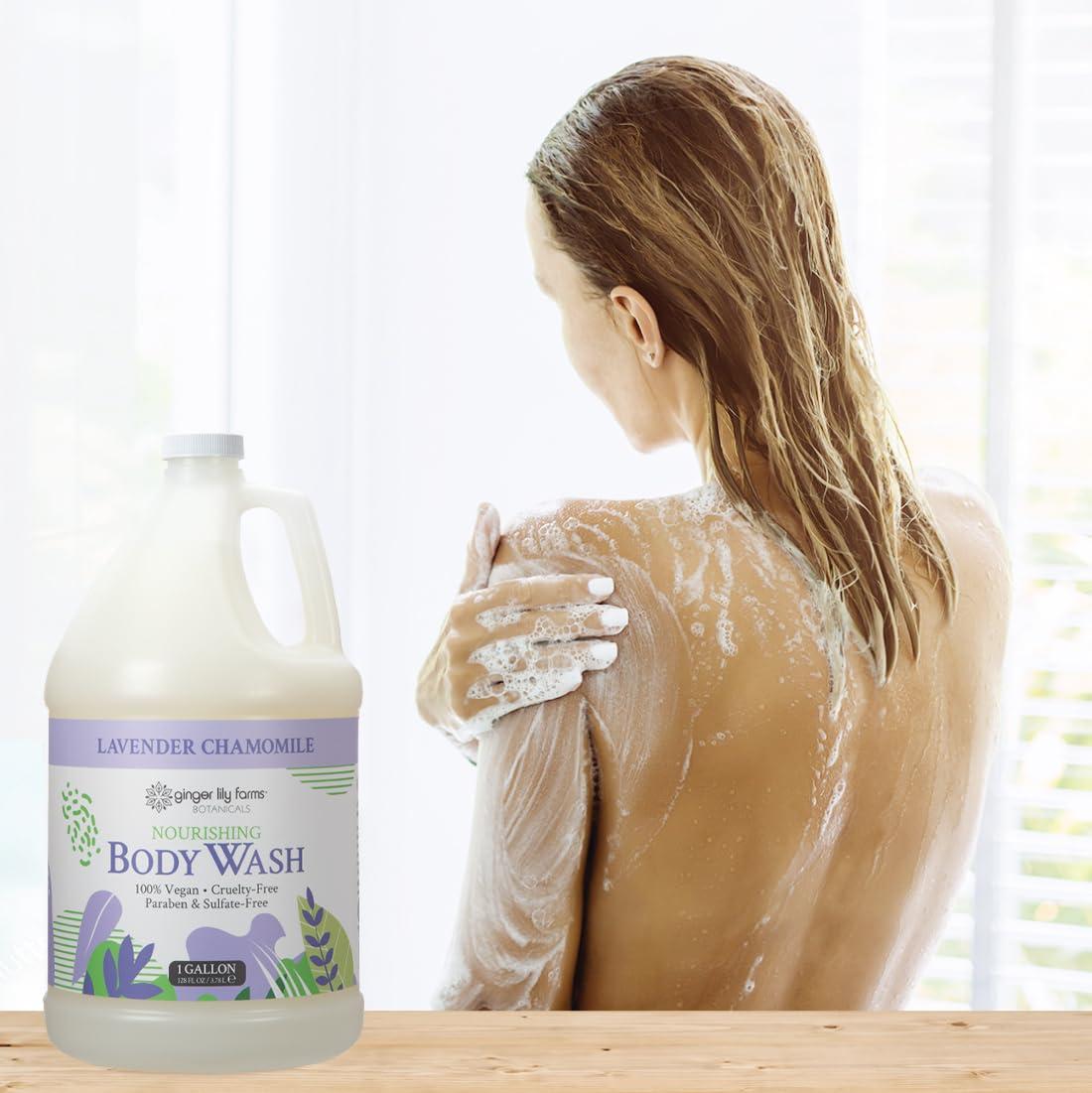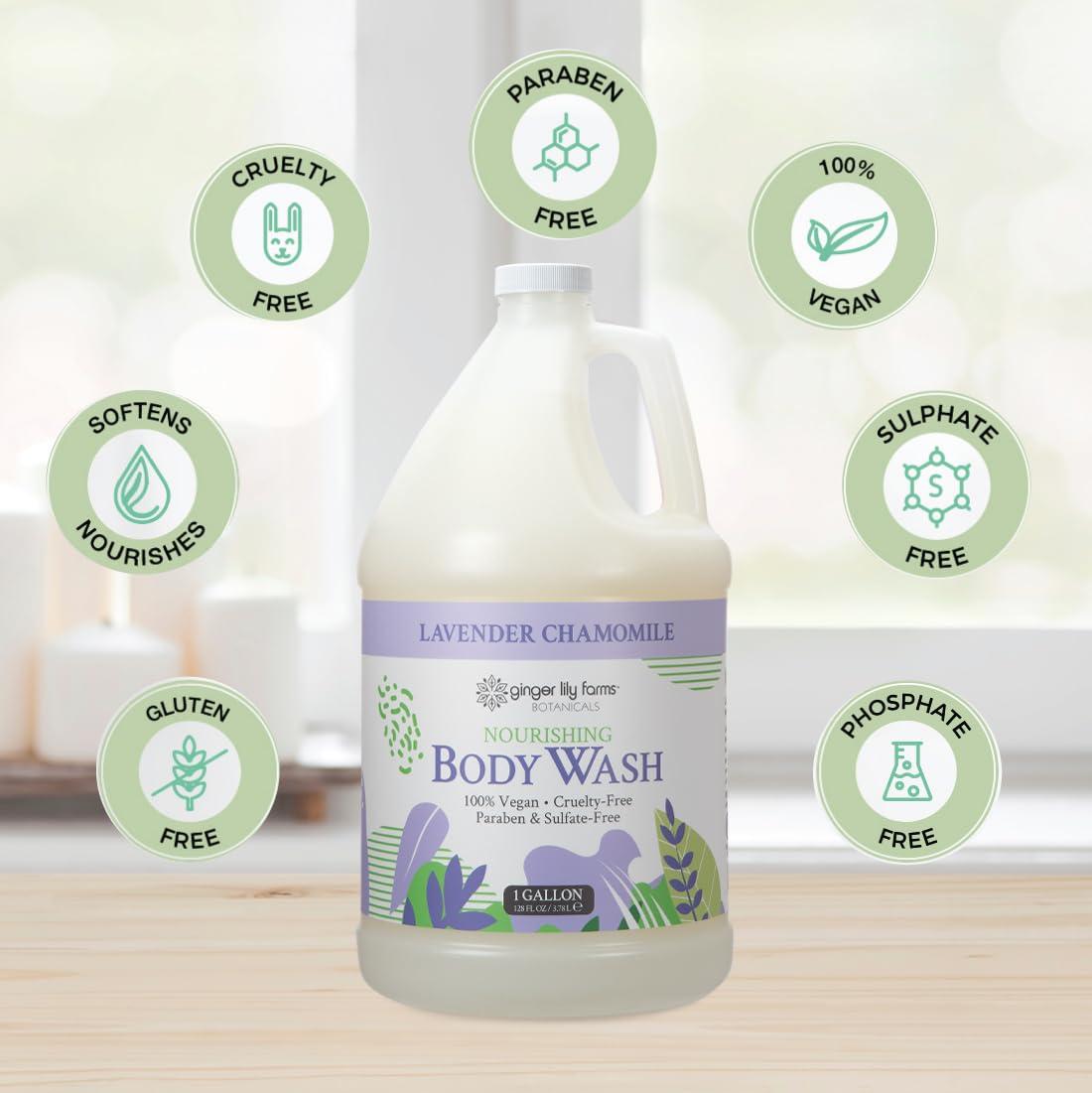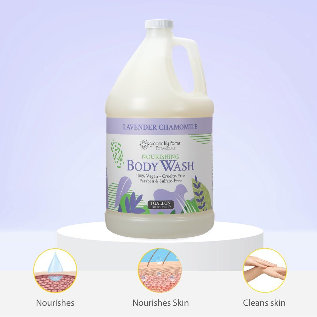Ginger Lily Farms Botanicals Lavender Chamomile Nourishing Body Wash delivers a powerful mix of moisturizing ingredients that leaves skin feeling nourished, healthy and refreshed. Formulated with pure essential oils of vetiver, nutmeg, lemon and orange and enriched with vitamin B5, aloe and flaxseed to soften, smooth and reinvigorate skin leaving your body deeply hydrated and refreshingly clean. Easily lathers on the skin to wash to away dirt, oil and bacteria. Natural spa quality formula contains no harsh chemicals like parabens, sulfates, phosphates or gluten and is gentle enough for even the most sensitive skin. Ginger Lily Farms Botanicals Nourishing Body Wash is 100% vegan, cruelty-free and PETA certified so you can feel good while using it. Perfect for fitness centers, locker rooms, spas and home use.