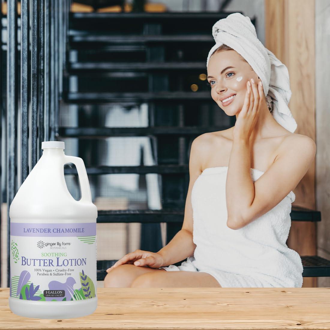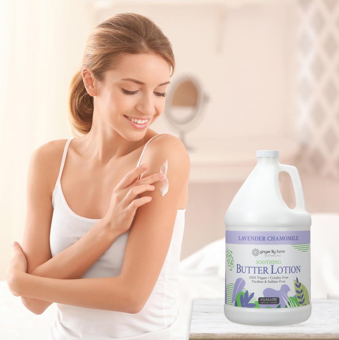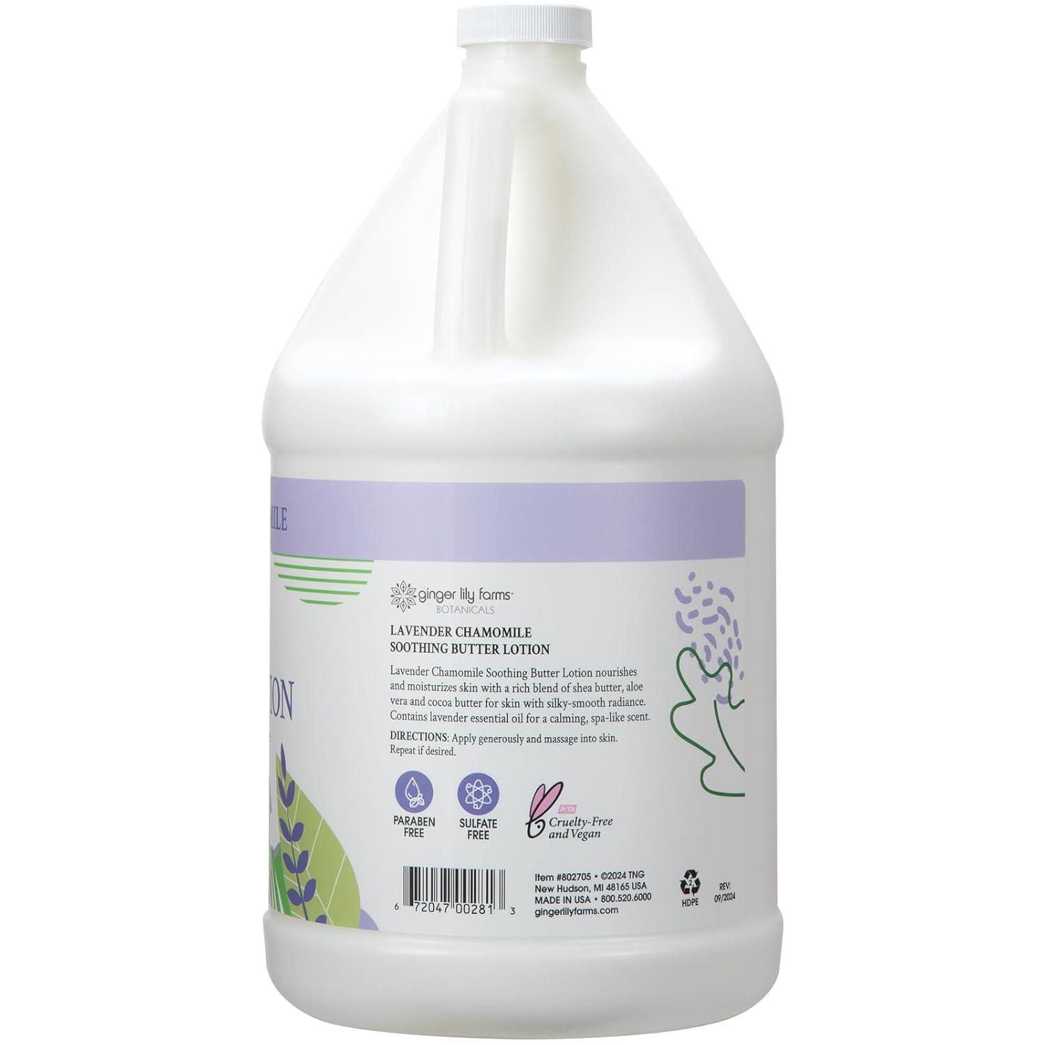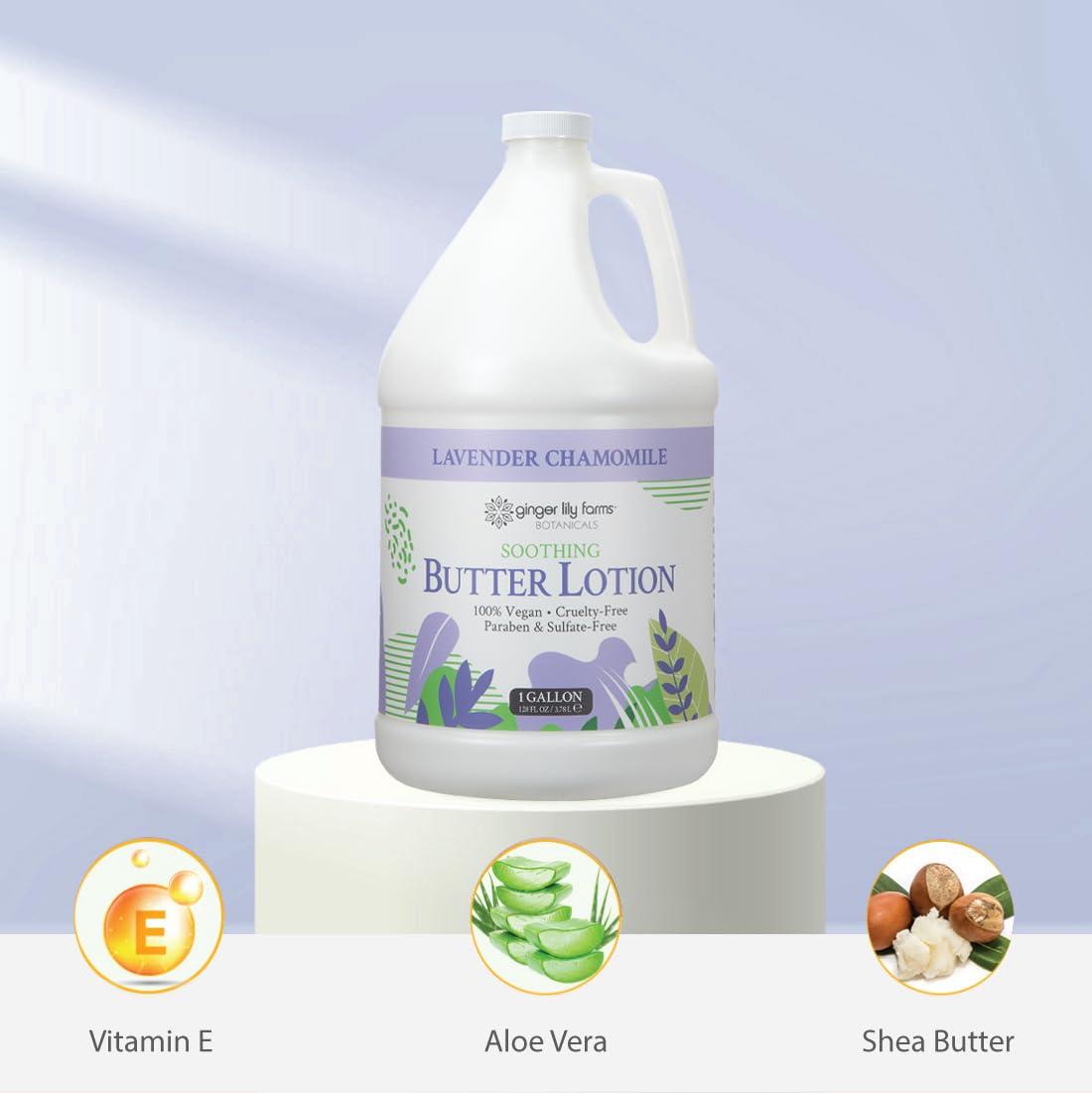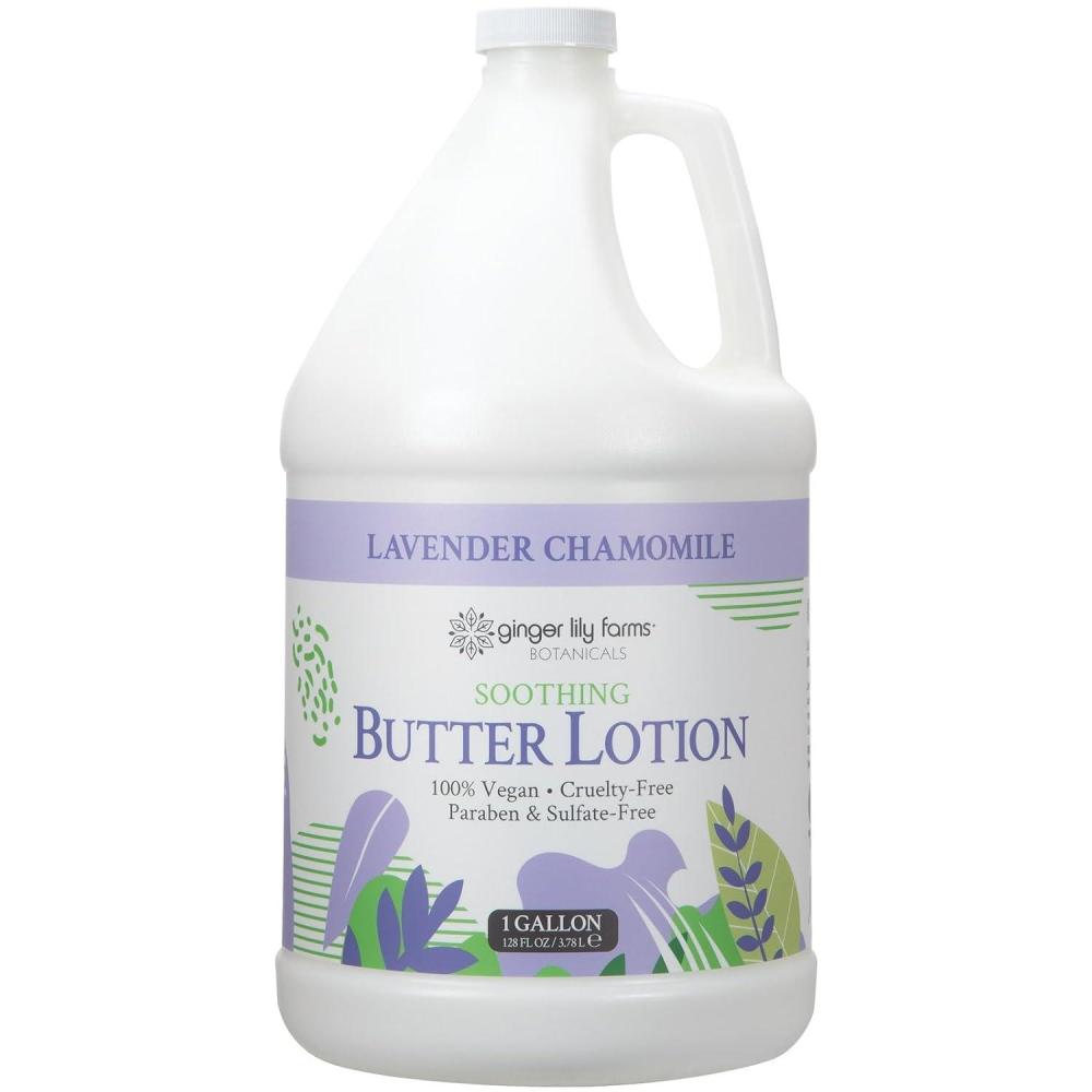 Ginger Lily Farms Botanicals Lavender Chamomile Soothing Butter Lotion nourishes and moisturizes skin leaving a silky-smooth radiance. Lightweight, non-greasy formula penetrates deeply into the skin’s surface to improve texture and reduce roughness and cracking. Our citrus scented butter lotion is formulated with vitamin E, shea butter and aloe vera for all day hydration. Naturally derived botanicals help prevent, protect and hydrate dry skin and replenish moisture for softer more radiant skin. Contains no harsh chemicals like parabens, sulfates, phosphates or gluten. Cruelty-free, PETA-certified and 100% vegan. Recommended for use right out of shower. Refill size is perfect for fitness centers, hotels, spas and home use. Directions: Apply Ginger Lily Farms Botanicals Soothing Butter Lotion generously and massage into skin. Repeat if desired.