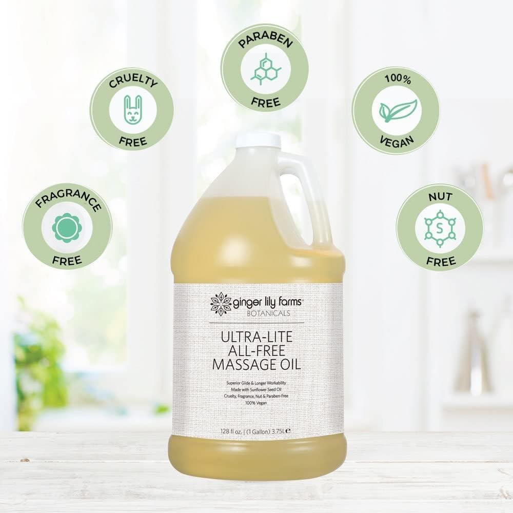 Ginger Lily Farms Ultra-Lite Massage Oil is made with the finest sunflower oil to leave your skin healthy, soft and moisturized. The ultra-lite massage oil ensures superior glide and longer workability, making it a massage therapist’s dream come true. The all free massage oil is fragrance free, nut free and paraben free. It is also cruelty free and made of 100% vegan ingredients.