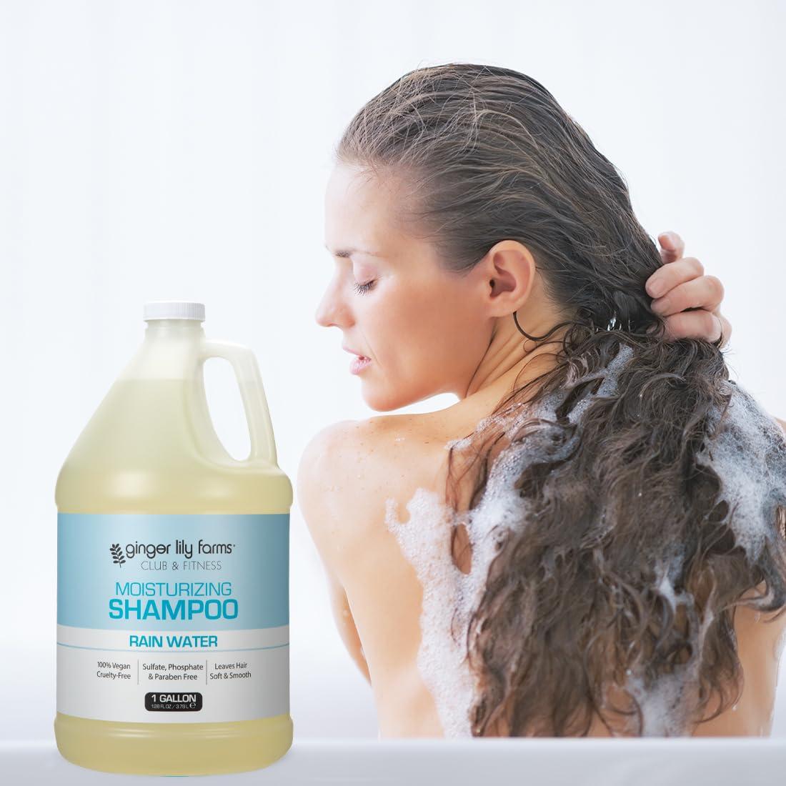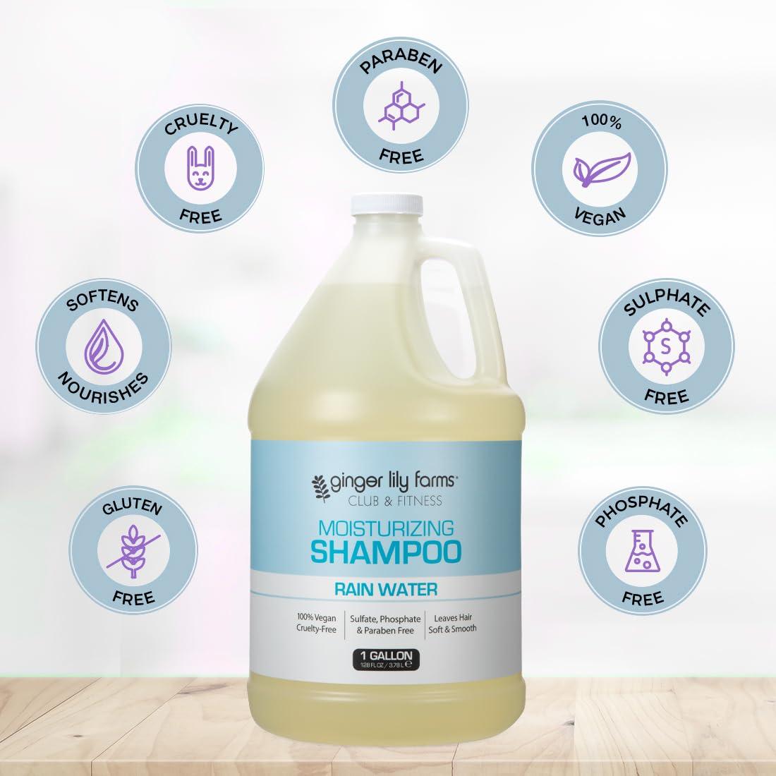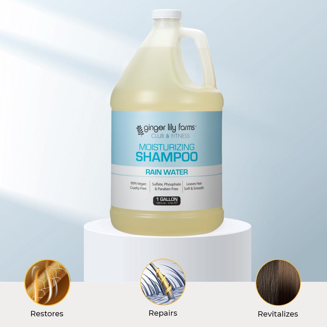 Ginger Lily Farms Club & Fitness Rain Water Moisturizing Shampoo smooths, restores and revitalizes dry hair with lasting moisture for incredibly soft, shiny hair. Our moisturizing shampoo works with your hair’s natural oils to deeply penetrate every hair strand and improve the overall health, look and feel of your hair. Dry hair is instantly restored and revitalized. Ginger Lily Farms Club & Fitness Hair Shampoo is enriched with naturally derived botanicals to provide weightless hydration to all hair types and is paraben, sulfate, phosphate and gluten-free. The cruelty-free conditioner is 100% vegan and PETA certified. Recommended for commercial use in locker rooms, hair salons, and home use for refills.