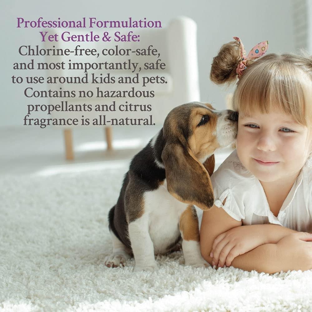 Professional Formulation Yet Gentle & Safe: Chlorine-free, color-safe, and most importantly, safe to use around kids and pets. Contains no hazardous propellants and citrus fragrance is all-natural.